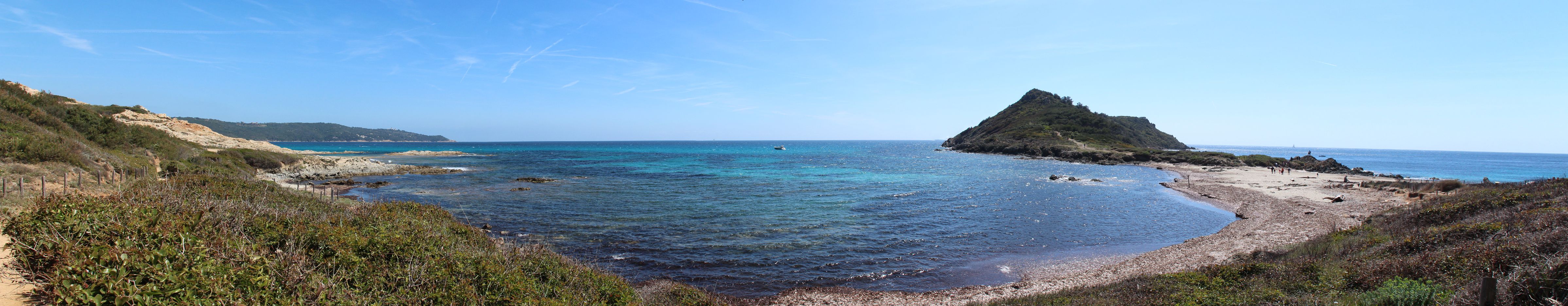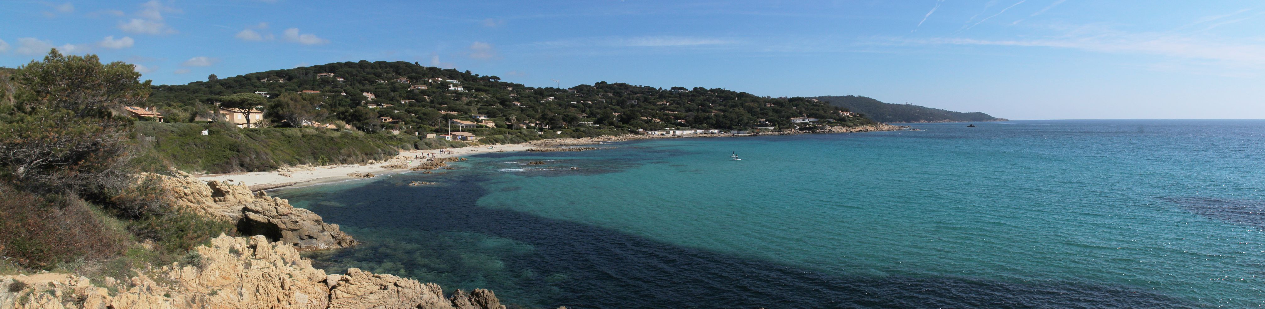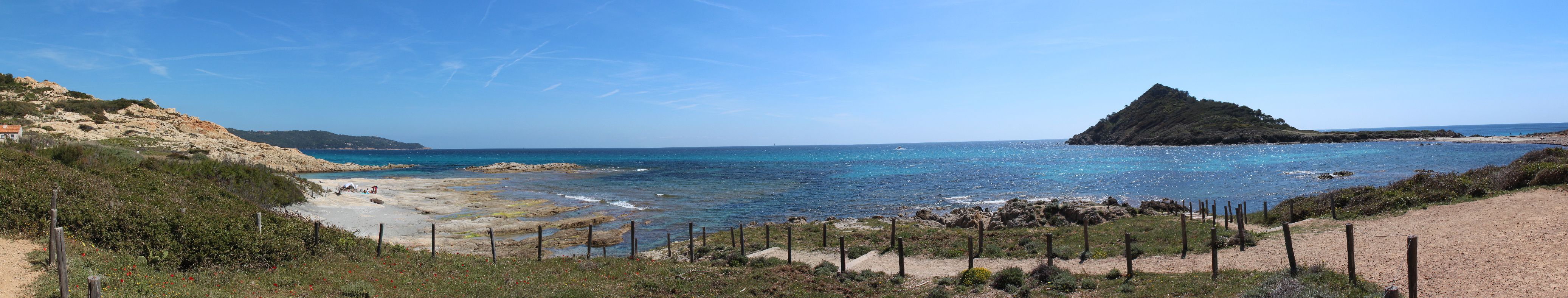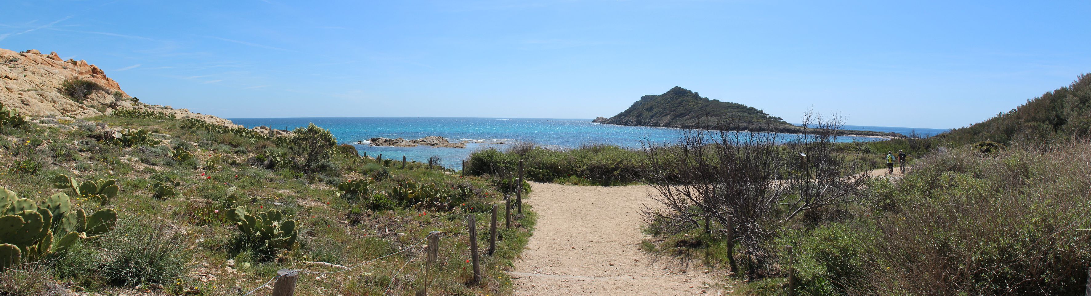 Dés que l’on quitte la ville vers l’est, le début de la ballade est marquée par l’île d’or, face à la plage du Dramont. C’est en 1897 qu’elle fut acquise par un architecte, mais c’est un certain docteur Auguste Lutaud qui en devient le nouveau propriétaire quelques années plus tard, lors d’une partie de cartes. Il y fait ériger une tour carrée suite à son auto-proclamation « Auguste 1er » souverain de l’île.
