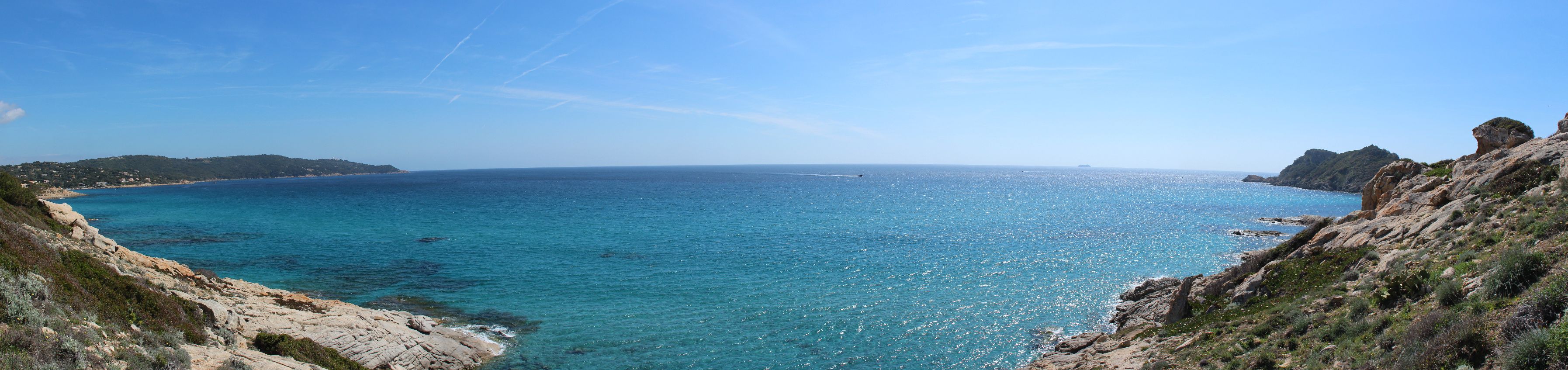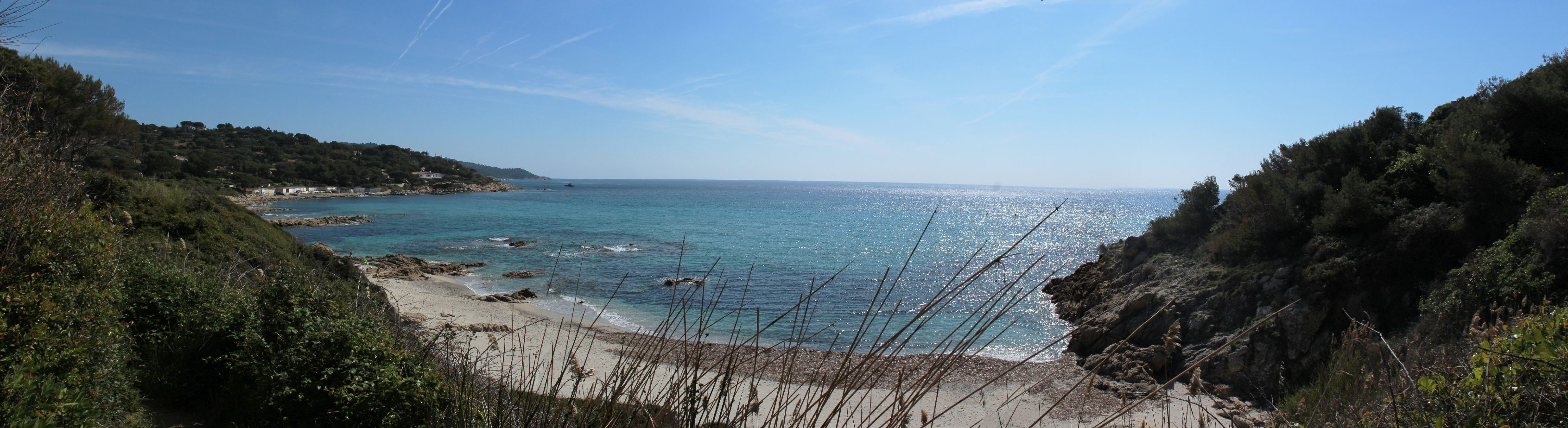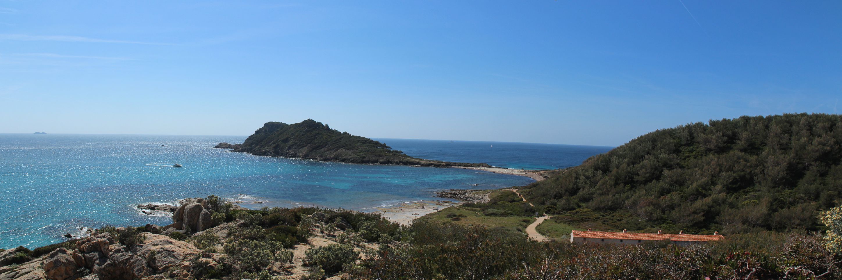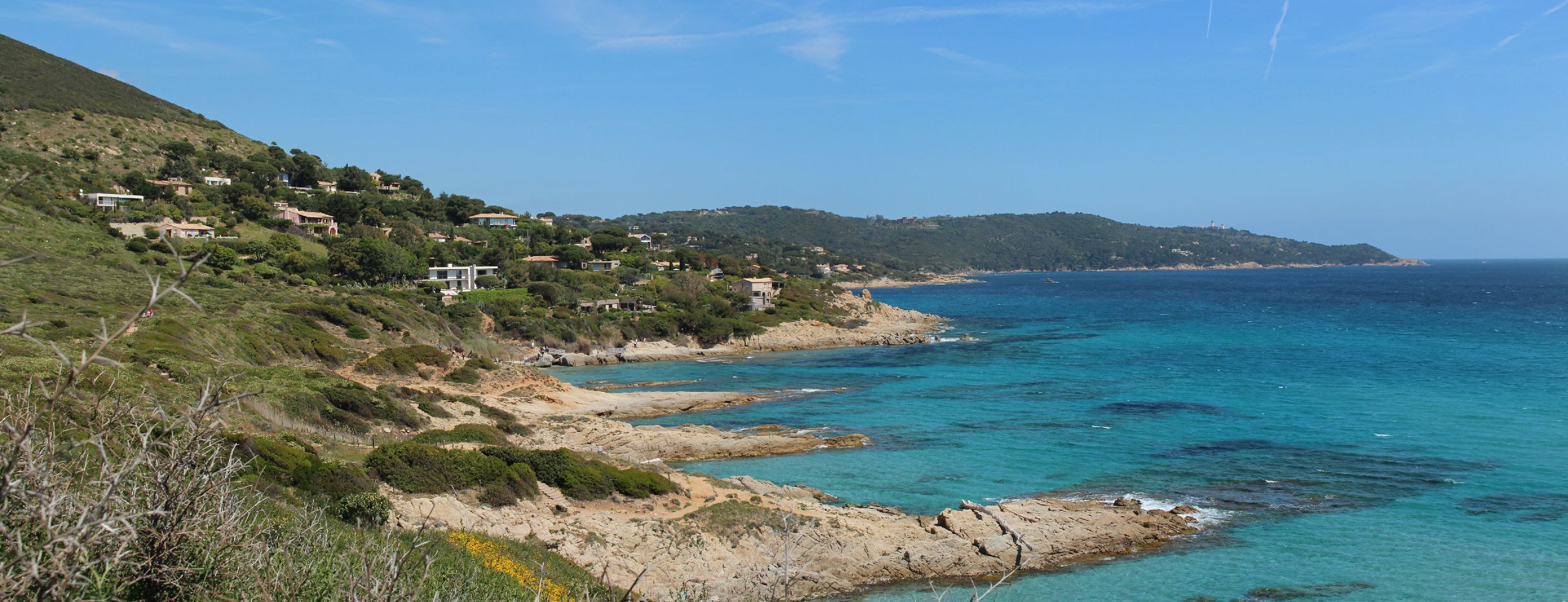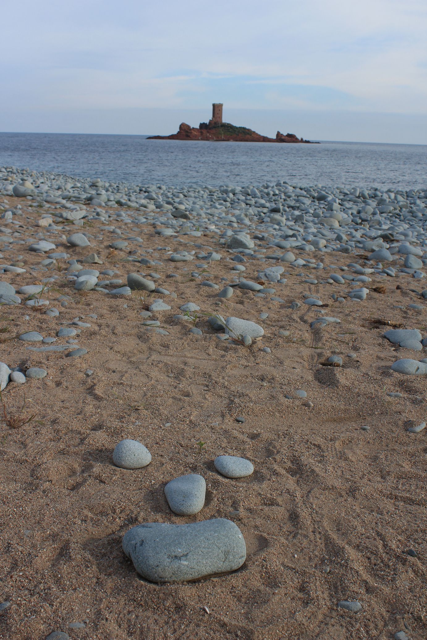 Dés que l’on quitte la ville vers l’est, le début de la ballade est marquée par l’île d’or, face à la plage du Dramont. C’est en 1897 qu’elle fut acquise par un architecte, mais c’est un certain docteur Auguste Lutaud qui en devient le nouveau propriétaire quelques années plus tard, lors d’une partie de cartes. Il y fait ériger une tour carrée suite à son auto-proclamation « Auguste 1er » souverain de l’île.