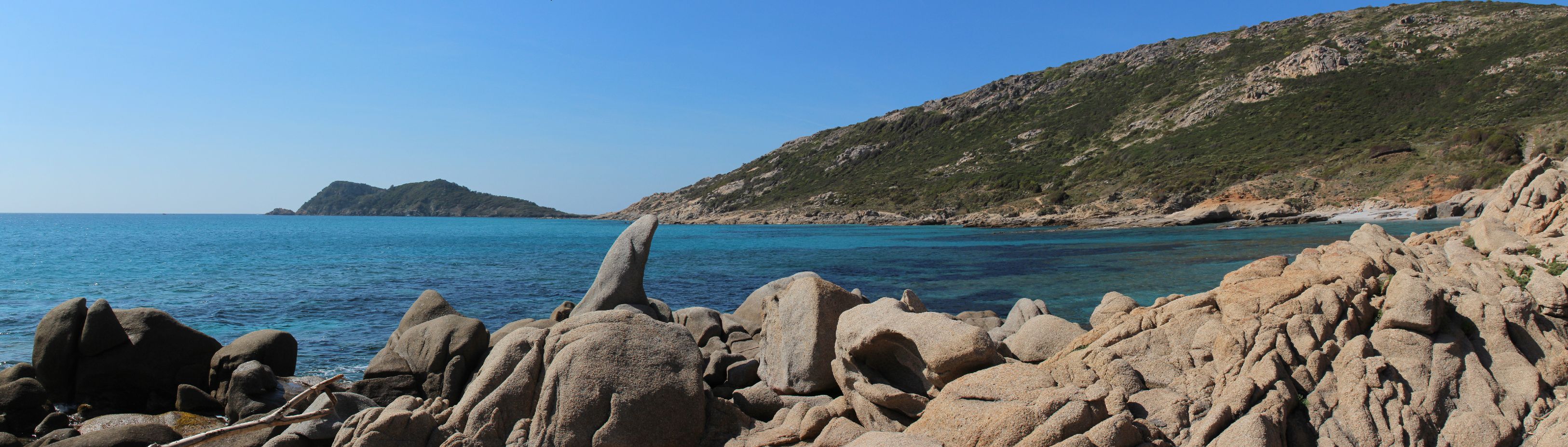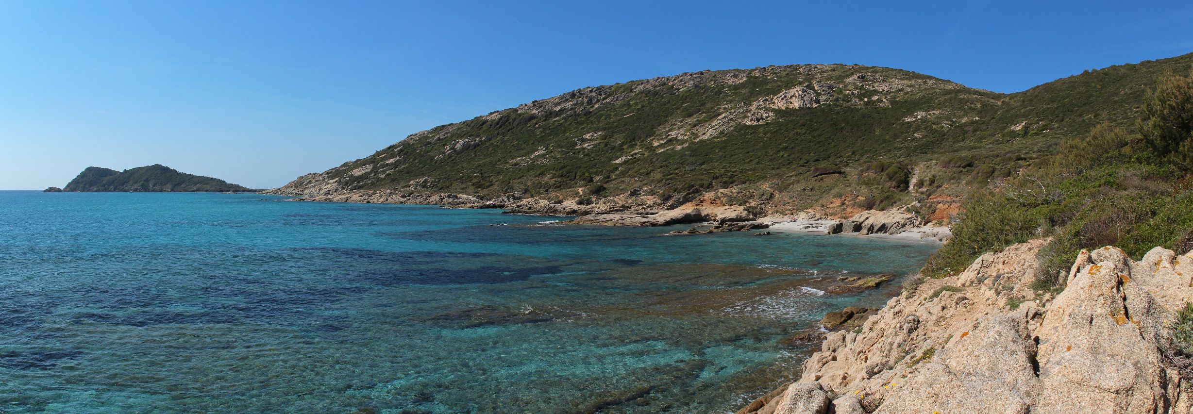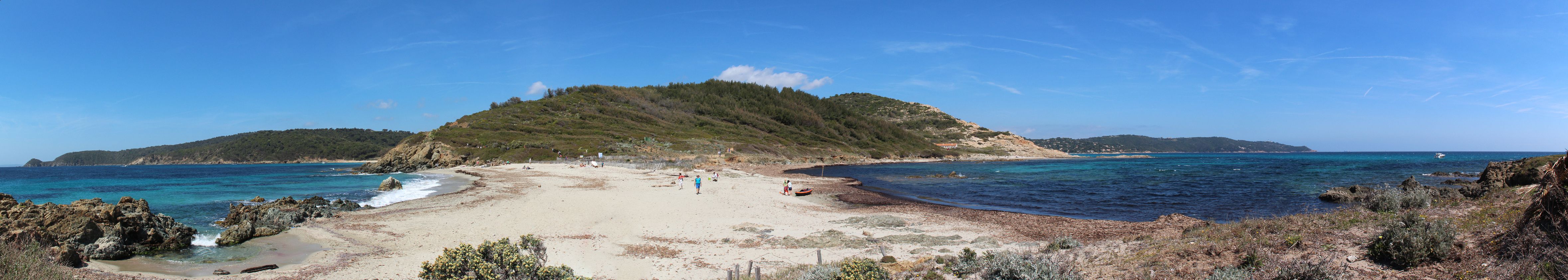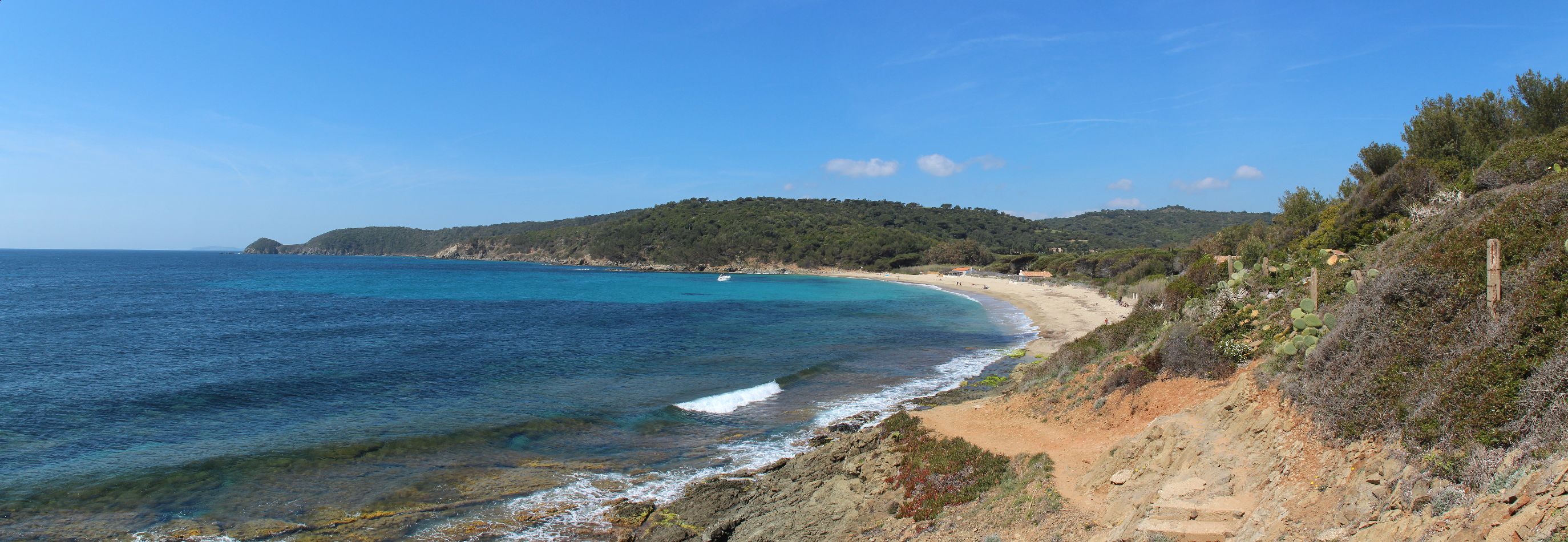 Dés que l’on quitte la ville vers l’est, le début de la ballade est marquée par l’île d’or, face à la plage du Dramont. C’est en 1897 qu’elle fut acquise par un architecte, mais c’est un certain docteur Auguste Lutaud qui en devient le nouveau propriétaire quelques années plus tard, lors d’une partie de cartes. Il y fait ériger une tour carrée suite à son auto-proclamation « Auguste 1er » souverain de l’île.