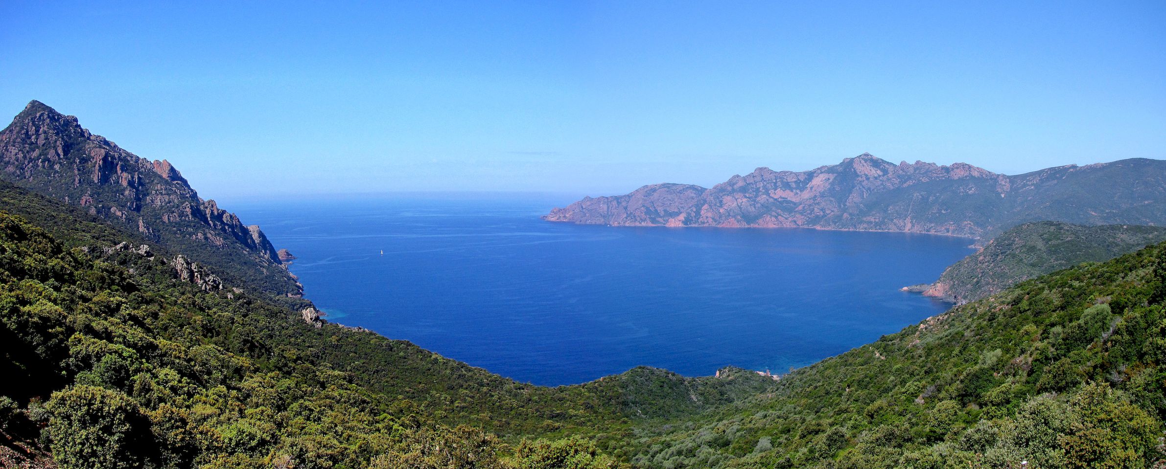 Depuis ce col la vue est encore plus belle et le rouge des rochers sur la mer lui donne un aspect violet. De l'autre coté c'est le golfe de PORTO qui apparaît avec un autre paysage en perspective.