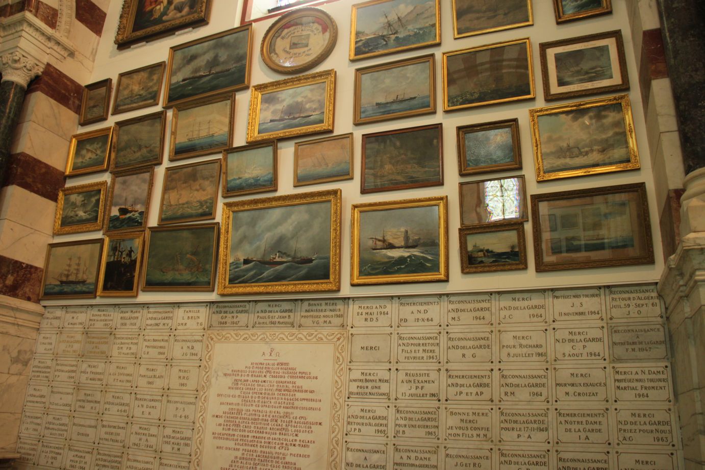 Des plaques de marbre et des offrandes peintes représentant des scènes totalement différentes recouvrent les murs des chapelles latérales.